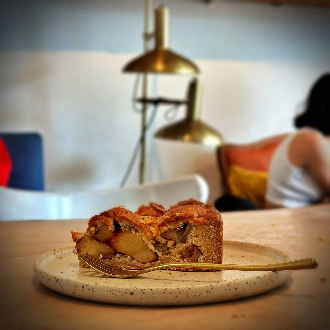 Wir bekommen genau, was wir möchten - leckeren Cappuccino, sehr guten Pour Over Coffee und köstlichen hausgemachten Apfelkuchen und dazu die gemütliche Geräuschkulisse eines belebten Nachbarschafts Cafés.