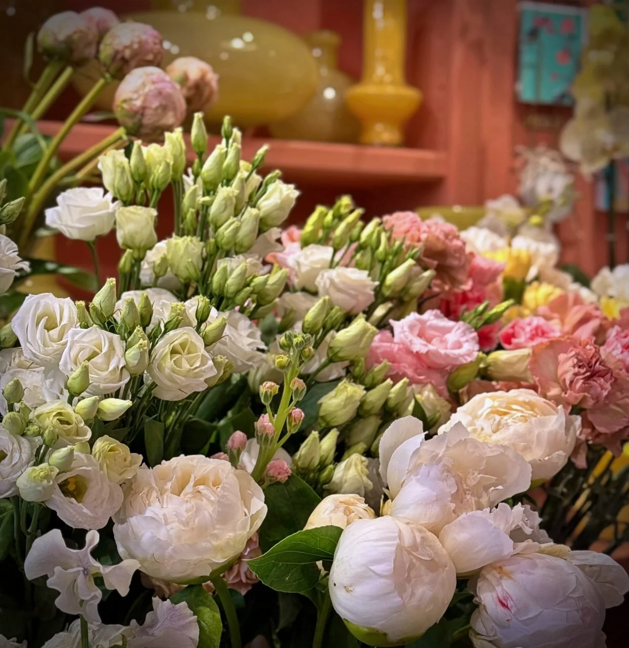 Ende Mai, wenn Pfingstrosen und Flieder duften, Maiglöckchen, Akelei und Ranunkeln blühen und sich Nelken und Malven in Pastelltönen öffnen, quillt der kleine Blumenladen fast über.