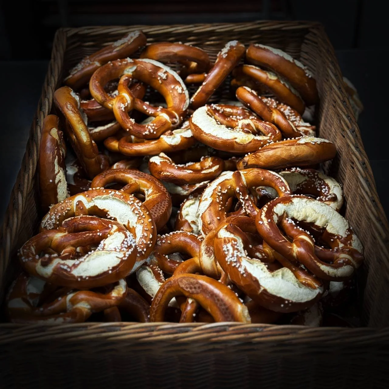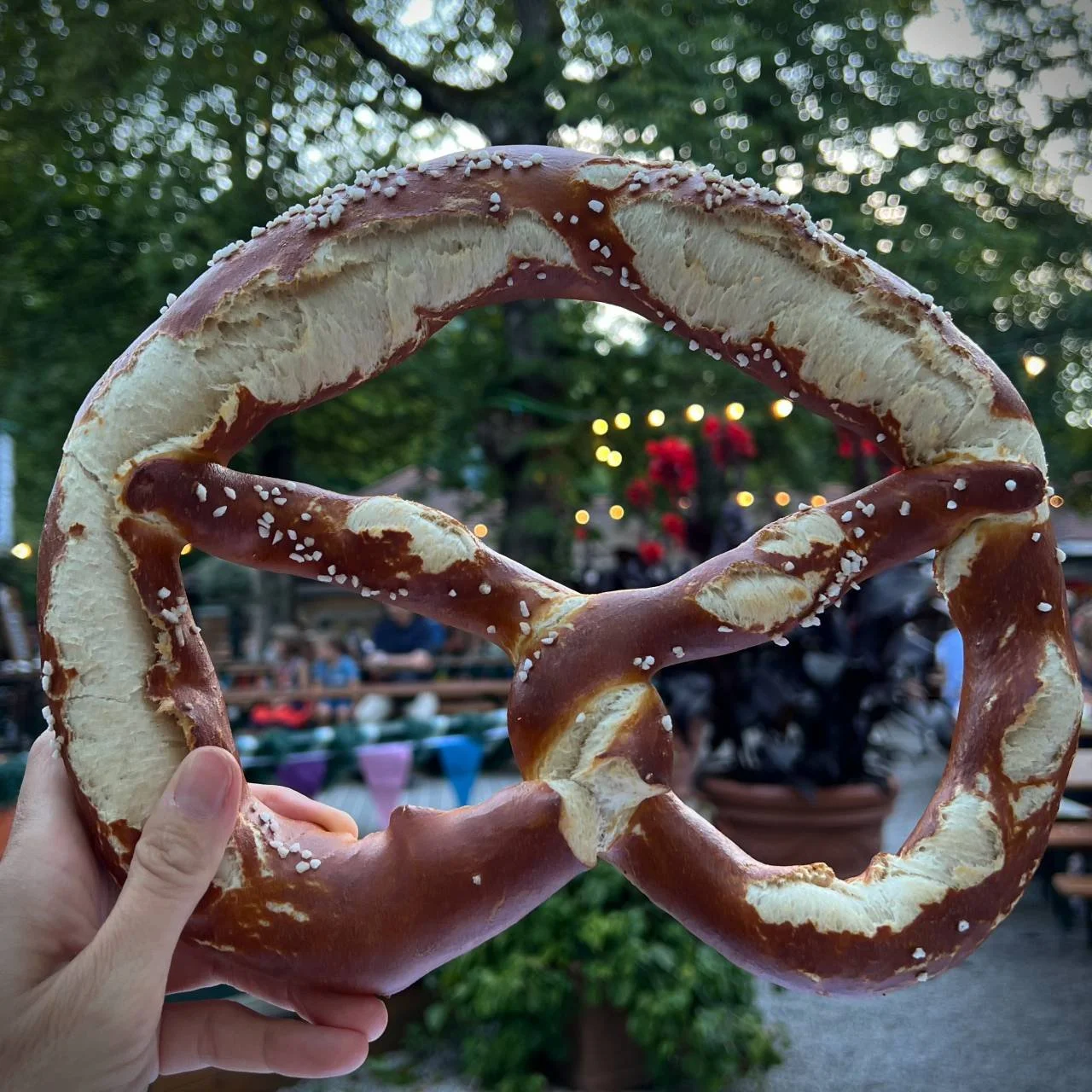 We love sitting by the music pavilion with sizzling roasted chicken or ribs, fresh pretzels and Obazda, grilled fish or cinnamon-sugared Aus‘zogene.