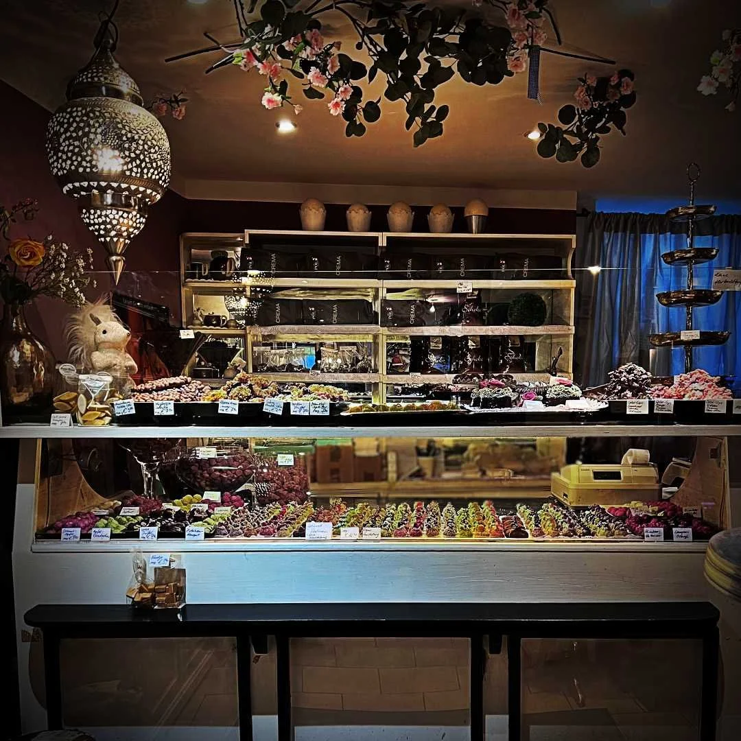 Liquid and cooled chocolate, gold leaf and sugar pearls, candied violets and roses, barberries and pistachios are transformed here into the most beautiful pralines.